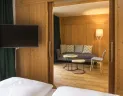 - Rodinná suita Deluxe (minim. 2 dospelí + 2 deti od 7 rokov, max. 2 dospelí + 3 deti od 7 rokov), cca 70 m2: priestranná rodinná suita resp. 3-priestorové ubytovanie so spálňou pre 2 osoby, oddeleným spacím priestorom s manželskou posteľou a obývačkou, 2 kúpeľne so sprcha/WC (jedna s vaňou), balkón, moderný štýl