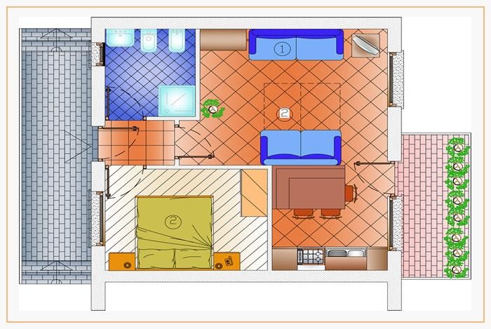 - Family apartmán 6 obsadený 6, 5 alebo 4 osobami (označenie partnera Trilo family): Apartmán pre max. 6 osôb. 2 x spálňa pre 2 osoby (2 os.), veľká obývacia izba s pohovkou a poschodovou posteľou (3 os.), vybavený kuchynský kút, kúpeľňa so sprchovacím kútom a sušičom vlasov. Balkón.