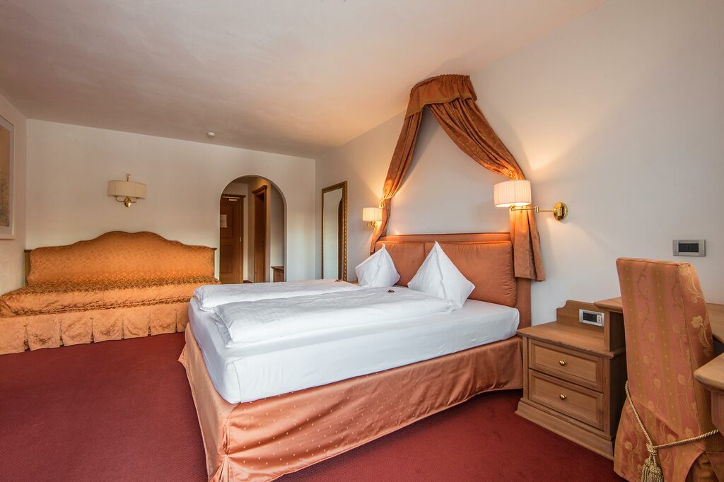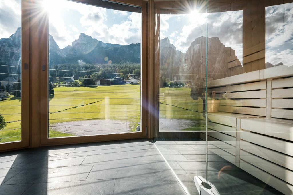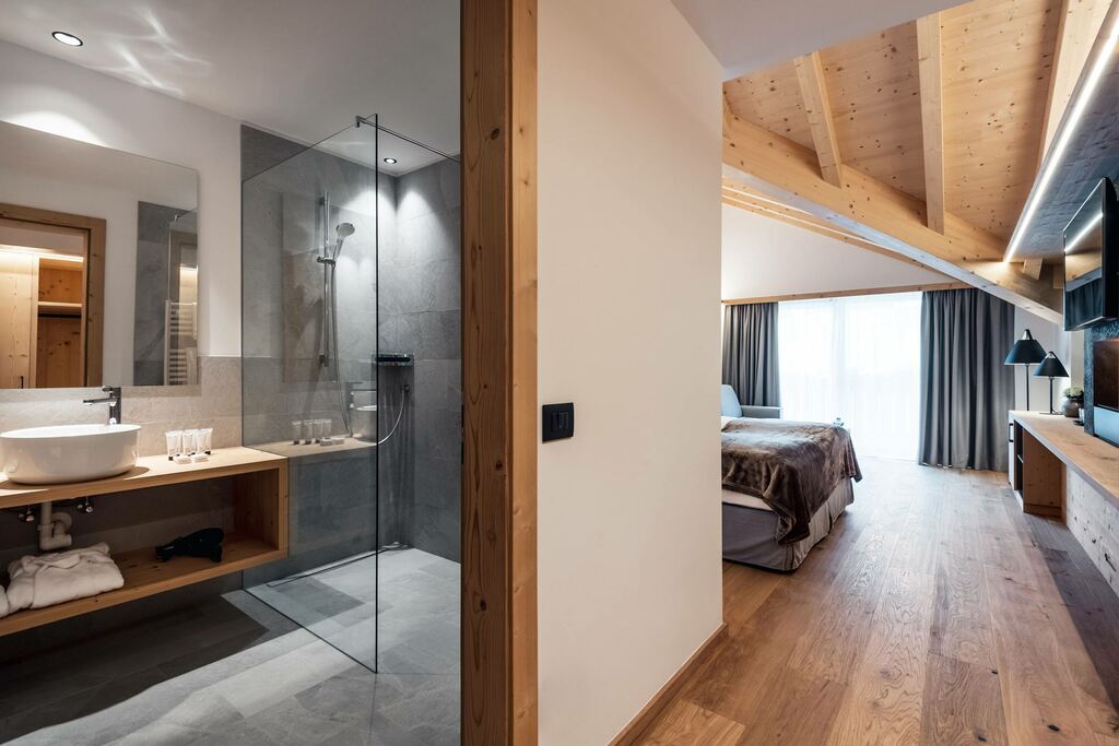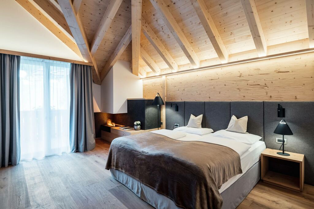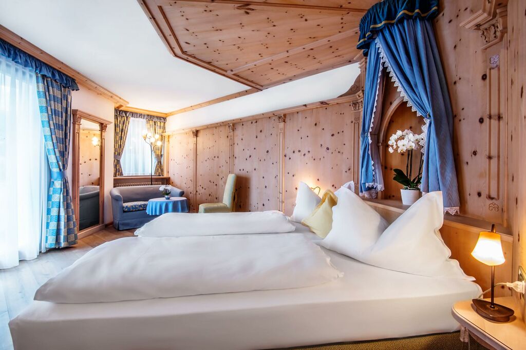 - Suita ROYAL DOLOMITES: veľký a priestranný apartmán. Hlavný vchod s chodbou, z ktorej sa vchádza do 2 samostatných izieb s rozlohou 30 m²: obe sú vybavené manželskou posteľou, obývacou časťou s rozkladacou pohovkou, krbom, kúpeľňou so sprchovacím kútom a veľkou panoramatickou terasou. Príslušenstvo do sauny (uterák, župan, kúpacie topánky), SAT TV s plochou obrazovkou, rádio, telefón, káblové pripojenie INTERNET, trezor a minibar.