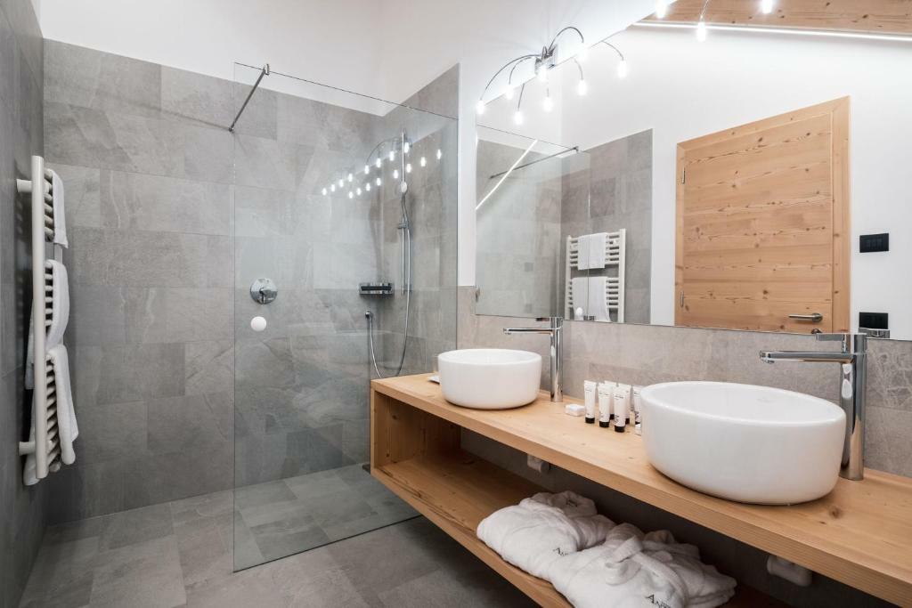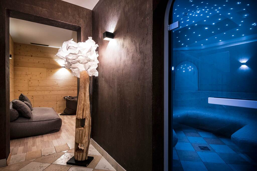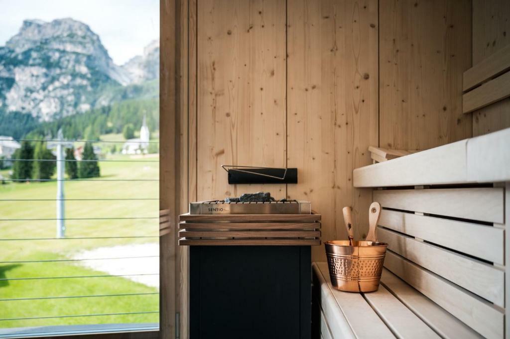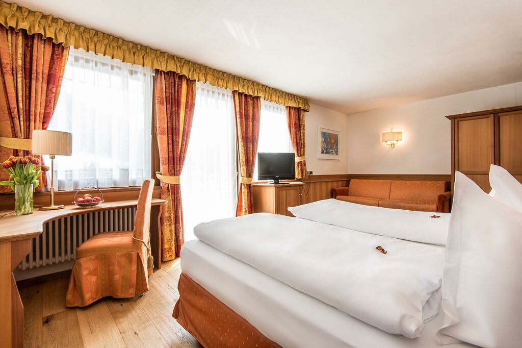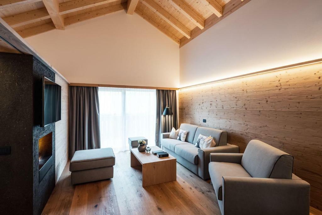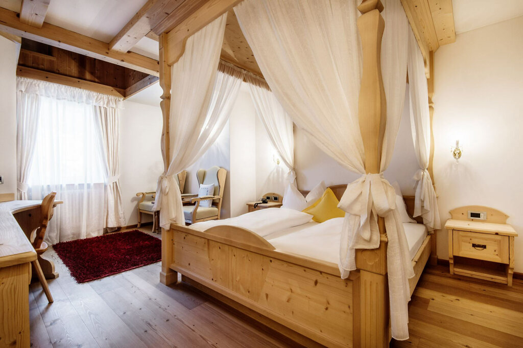 - Suita ROYAL DOLOMITES: veľký a priestranný apartmán. Hlavný vchod s chodbou, z ktorej sa vchádza do 2 samostatných izieb s rozlohou 30 m²: obe sú vybavené manželskou posteľou, obývacou časťou s rozkladacou pohovkou, krbom, kúpeľňou so sprchovacím kútom a veľkou panoramatickou terasou. Príslušenstvo do sauny (uterák, župan, kúpacie topánky), SAT TV s plochou obrazovkou, rádio, telefón, káblové pripojenie INTERNET, trezor a minibar.