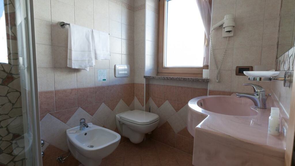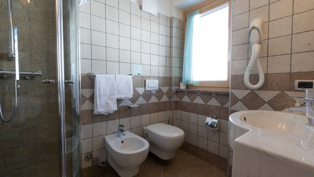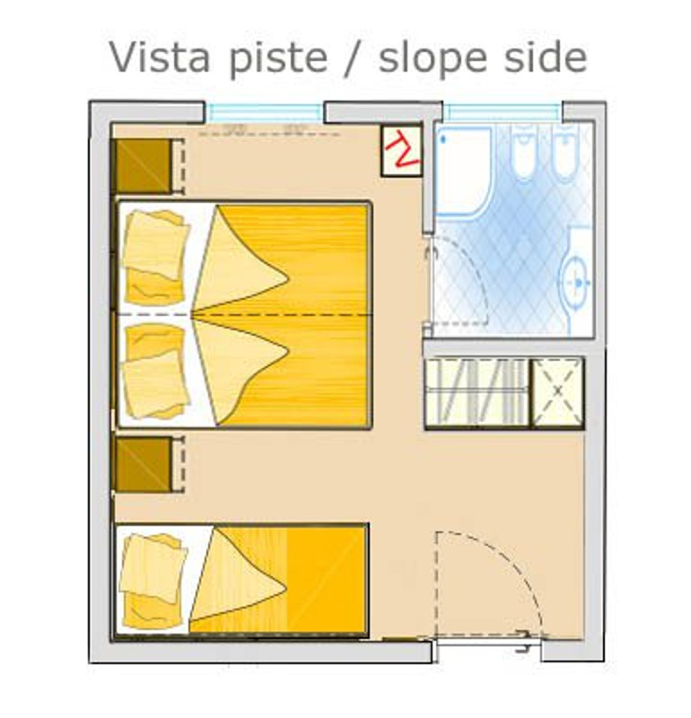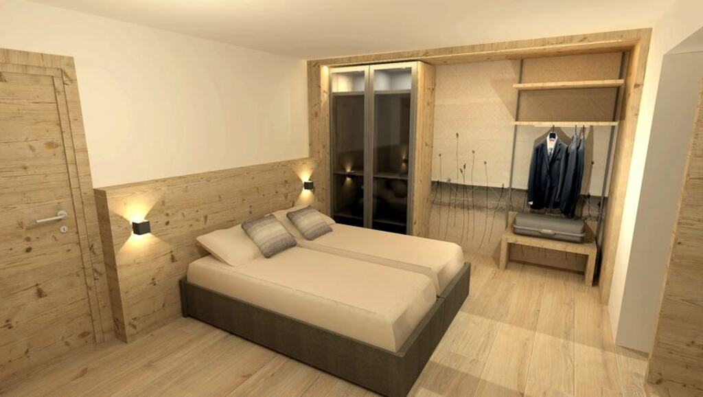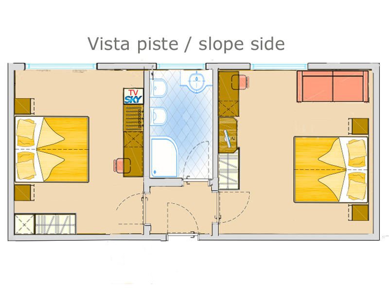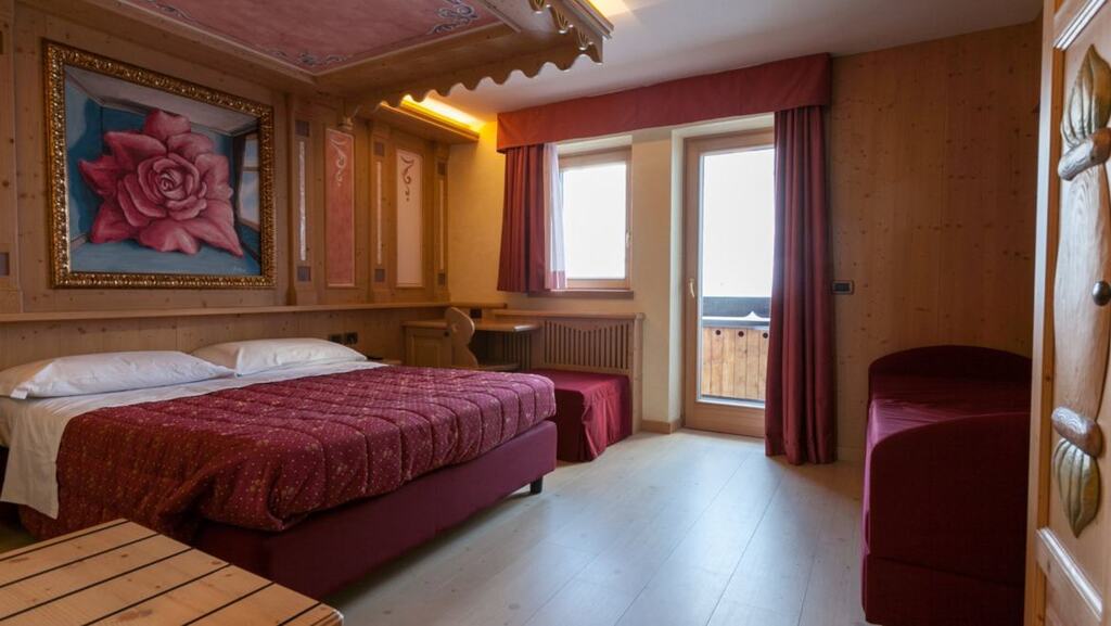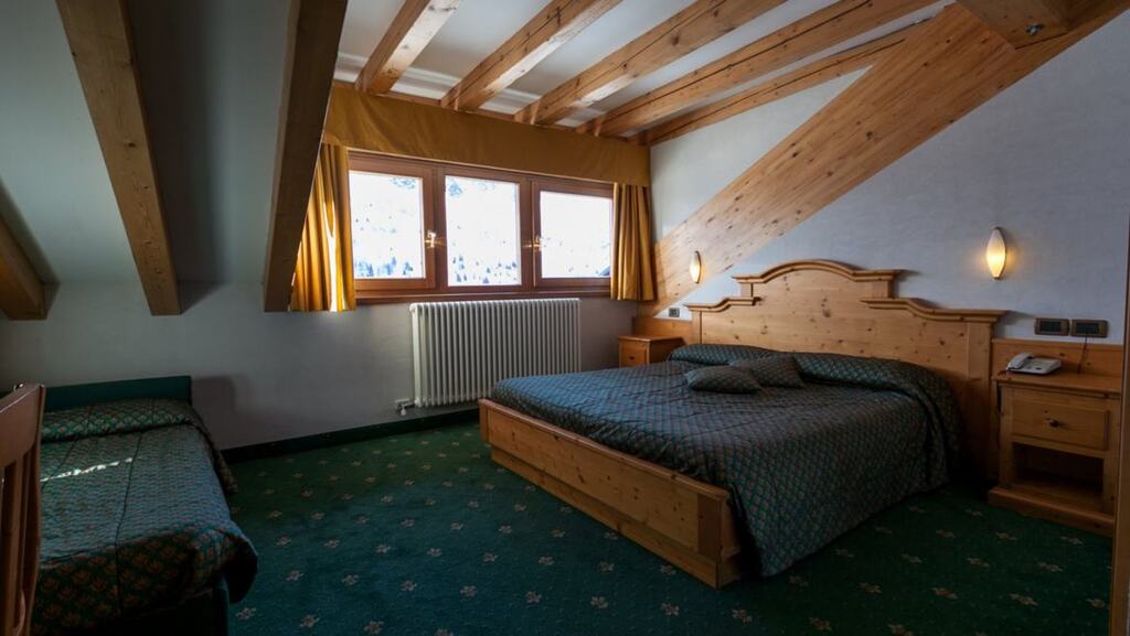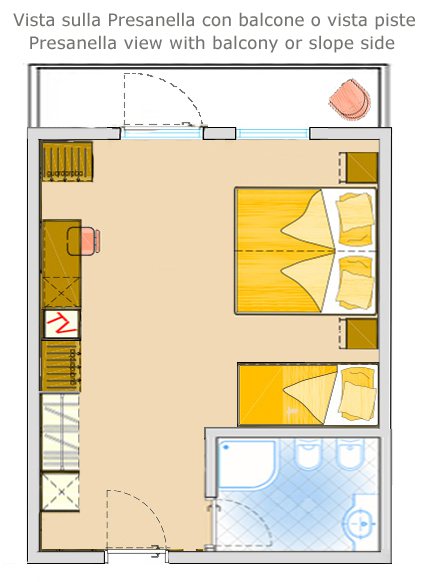 - 3-posteľová izba Superior (3-4 osoby, cca 18 m2 - z toho kúpeľňa 4 m2): izba s 3 posteľami (nie je možné doplniť ďalšiu posteľ ani detskú postieľku). Výhľad na svahy alebo balkón alebo najvyššie poschodie s výhľadom na masív Presanella.