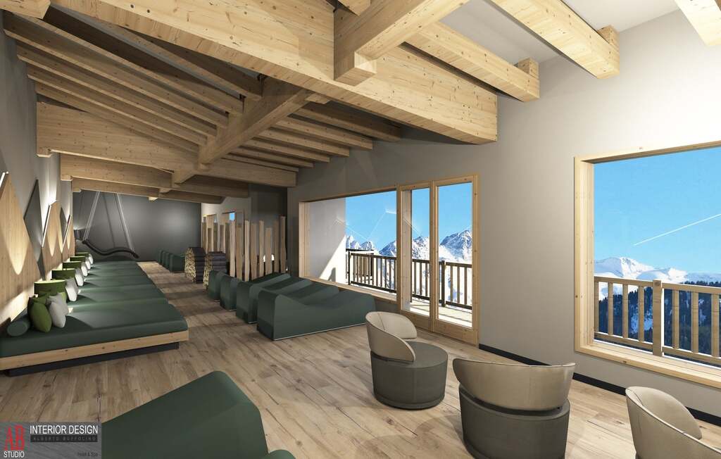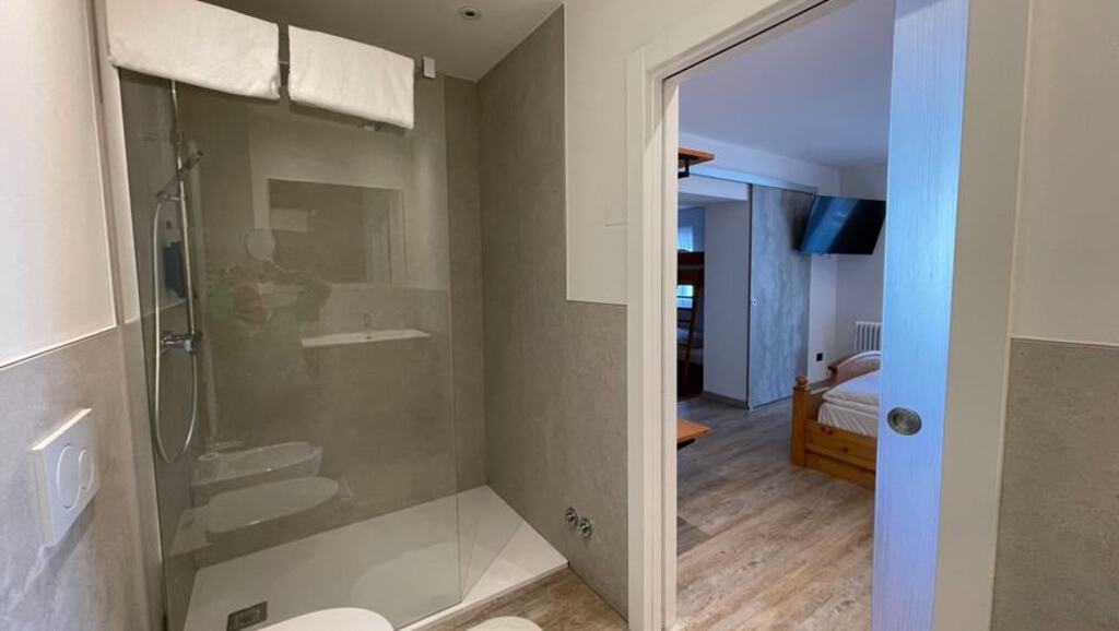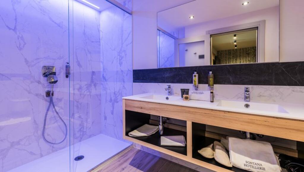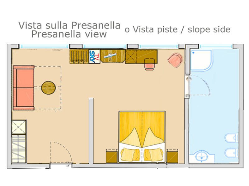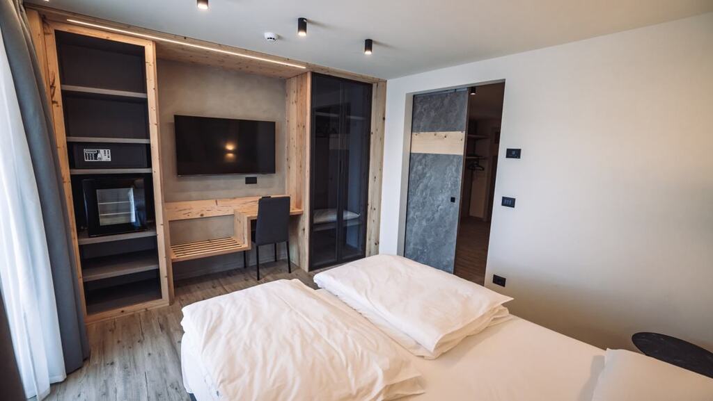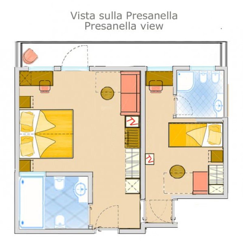 - Suita (2-5 osôb, cca 25 m2 - z toho kúpeľňa 6-9 m2): manželská posteľ king size a rozkladacia pohovka (alebo poschodová posteľ), možné doplniť piatu posteľ. Veľká kúpeľňa. Výhľad na horu Presanella či fantastický výhľad na svahy.