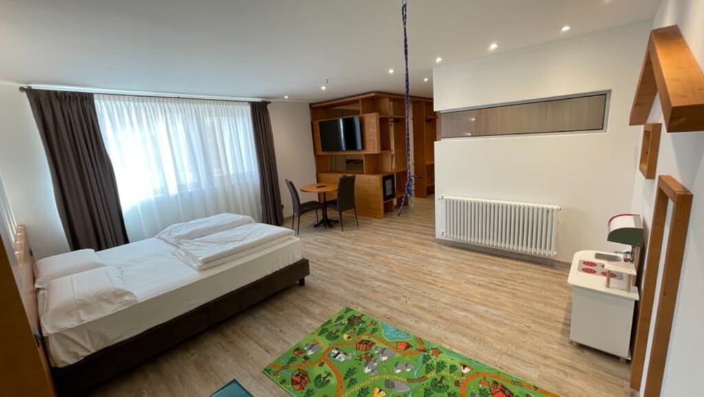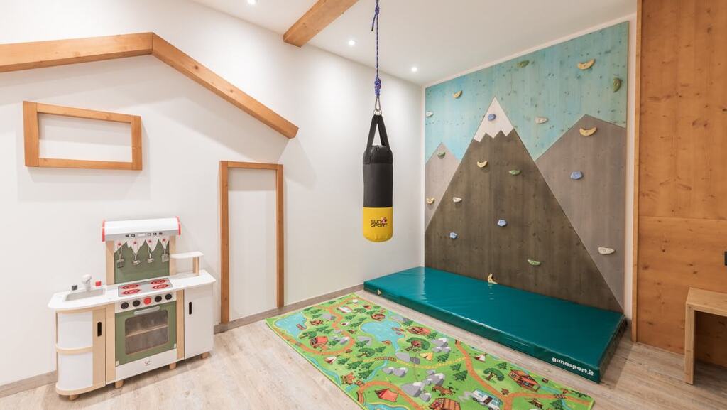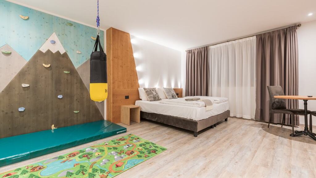 - Rodinná suita Cristiano (4-8 osôb, cca 70 m2): rodičovská zóna (kúpeľňa, manželská posteľ king size, šatník) a detská zóna (kúpeľňa, Montessori knižnica, 2 poschodové postele). Zóna s detskou lezeckou stienkou, lanom, hracou kuchynkou,...