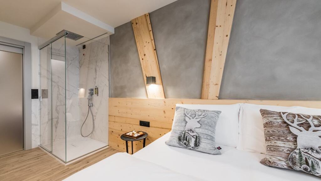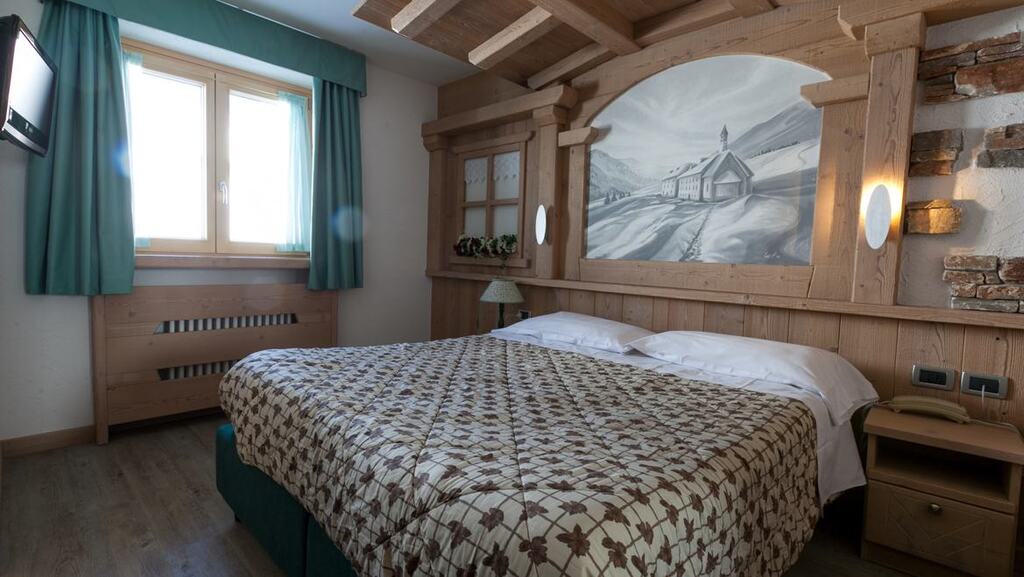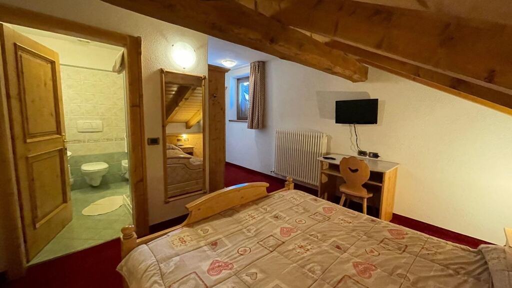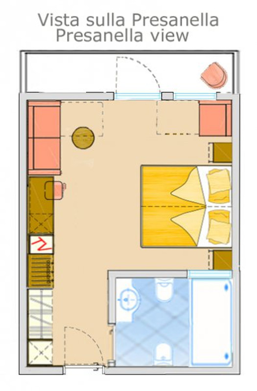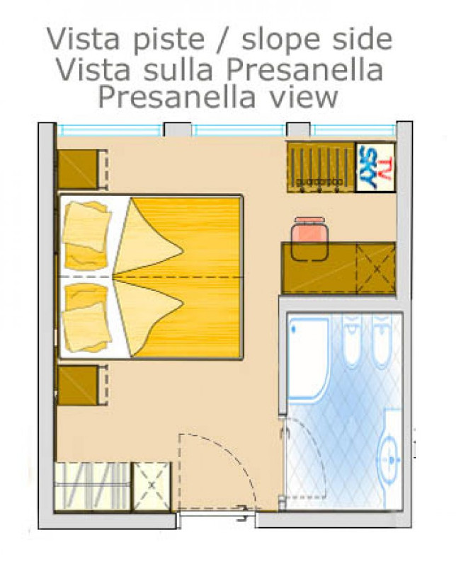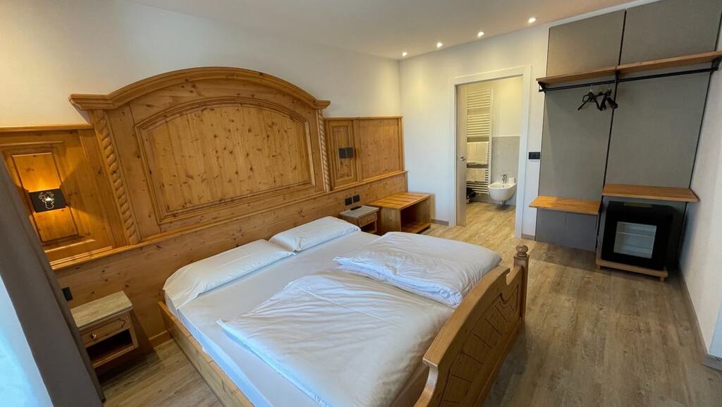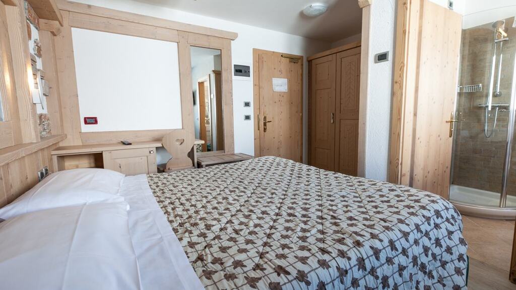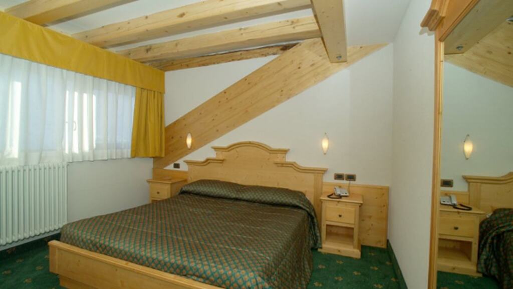 - Dvojposteľová izba Superior (1-2 osoby, cca 15 m2): podkrovné izby na najvyššom poschodí. Výhľad na horu Presanella alebo na lyžiarske svahy.