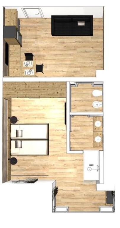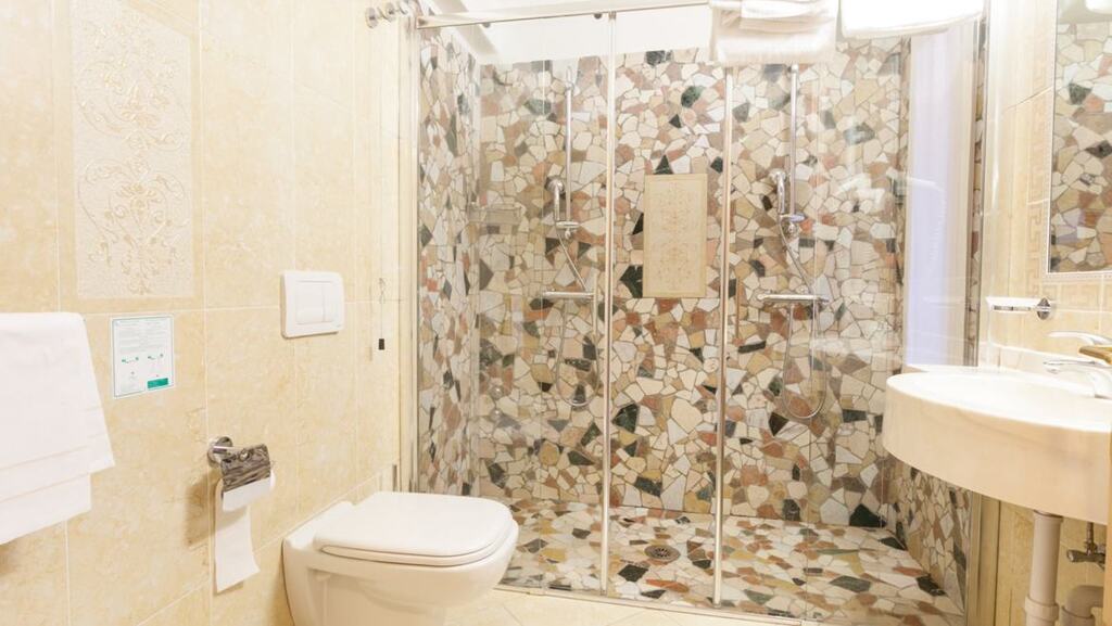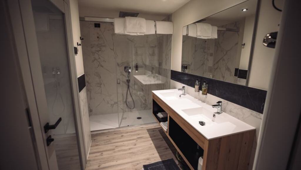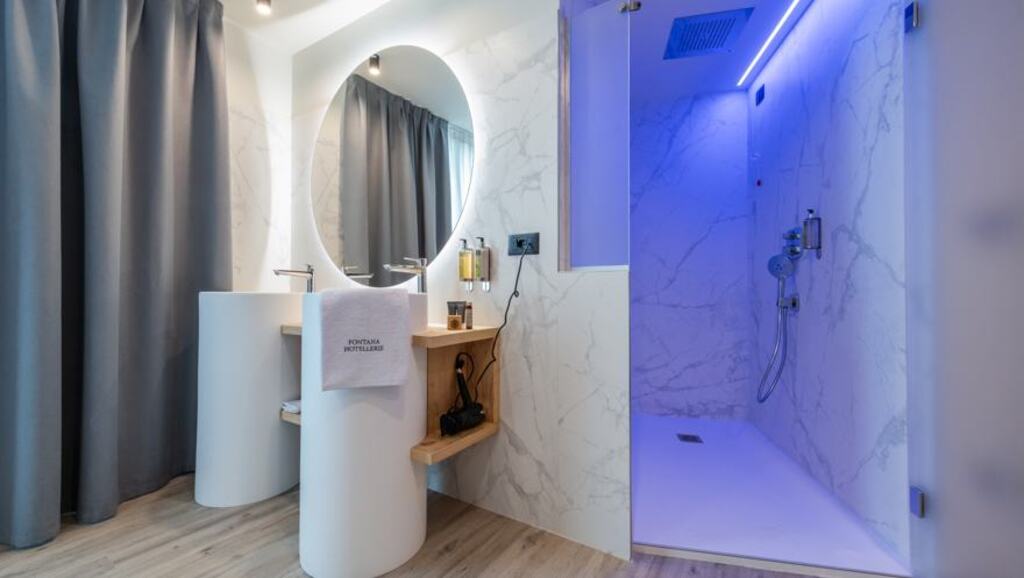 - Rodinná suita Ettore (3-6 osôb, cca 45 m2): detská časť s rozkladacou pohovkou a poschodovou posteľou, rodičovská časť s posteľou king size a sprchou. Kúpeľňa.