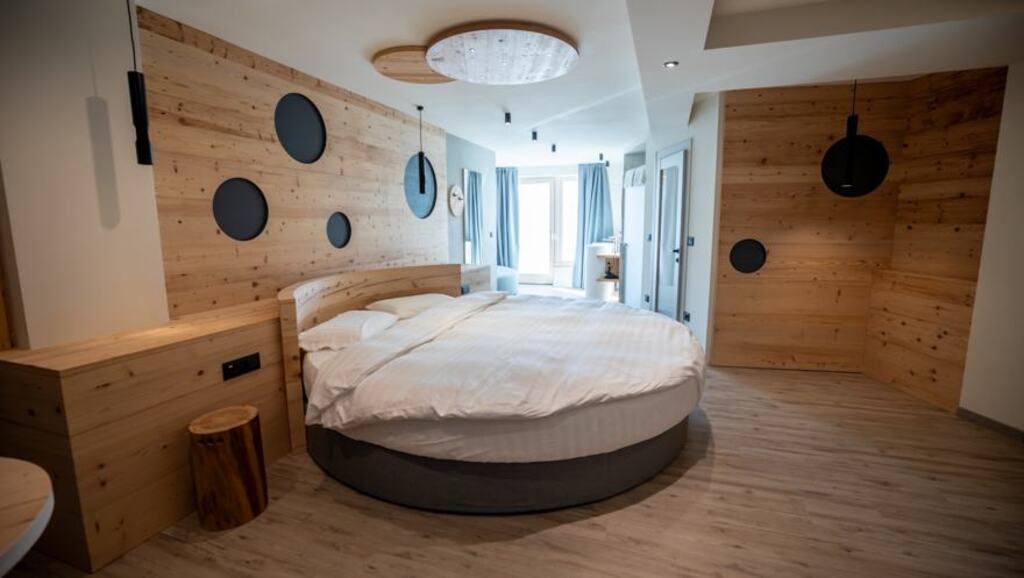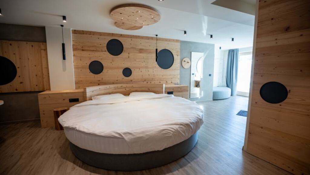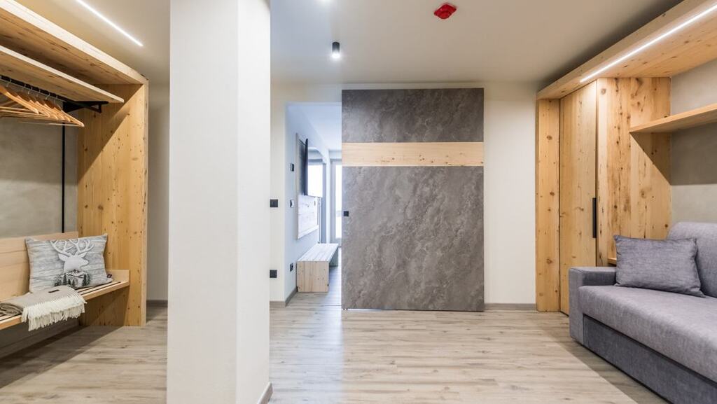 - Junior Suita Romantic (2-5 osôb, cca 22 m2): izby na 1. poschodí. Balkón s výhľadom na horu Presanella. Ideálne pre páry, ktoré milujú priestranné prostredie a pre rodiny až do 5 osôb.