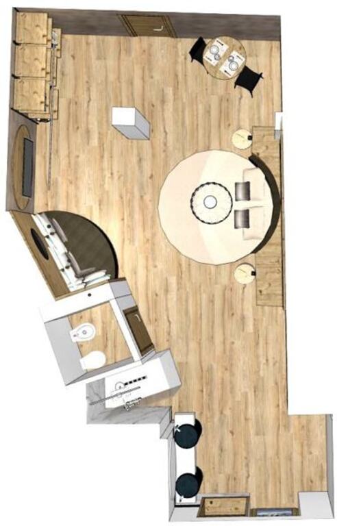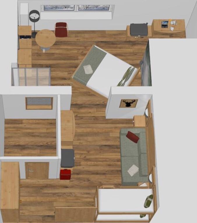 - Junior Suita (2-4 osoby, cca 22 m2 - z toho kúpeľňa 4,3 m2): podkrovné izby. Pre 4. osobu bude pridaná posteľ.