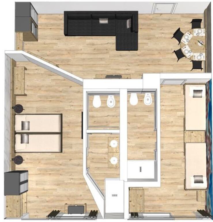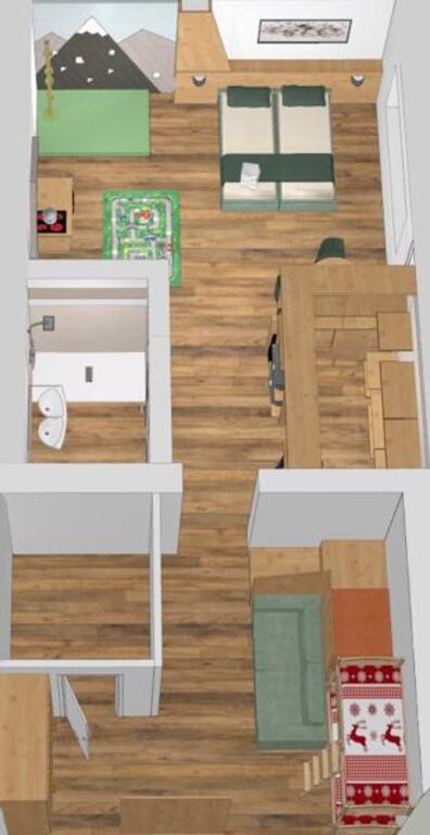 - Rodinná suita Franz (3-8 osôb, cca 70 m2): salón (pohovka rozšíriteľná pre 3 osoby), rodičovská izba (manželská posteľ) a detská izba (2 samostatné postele), 2 kúpeľne