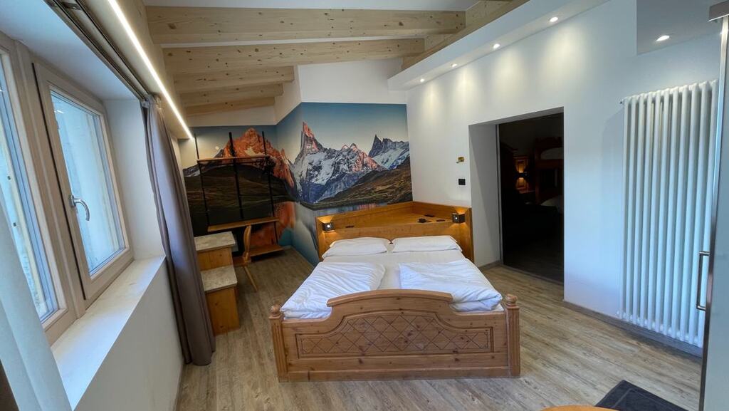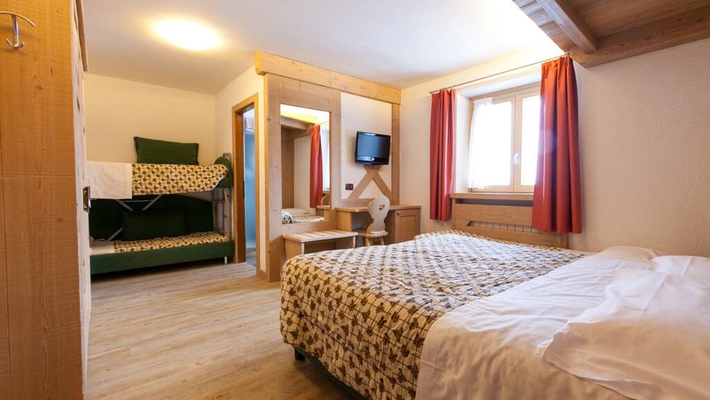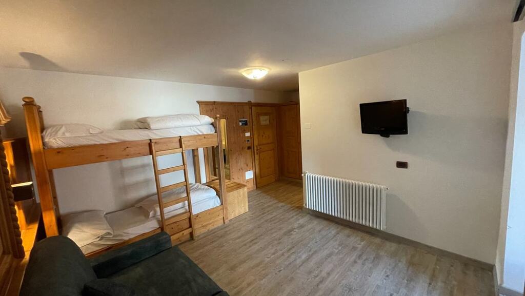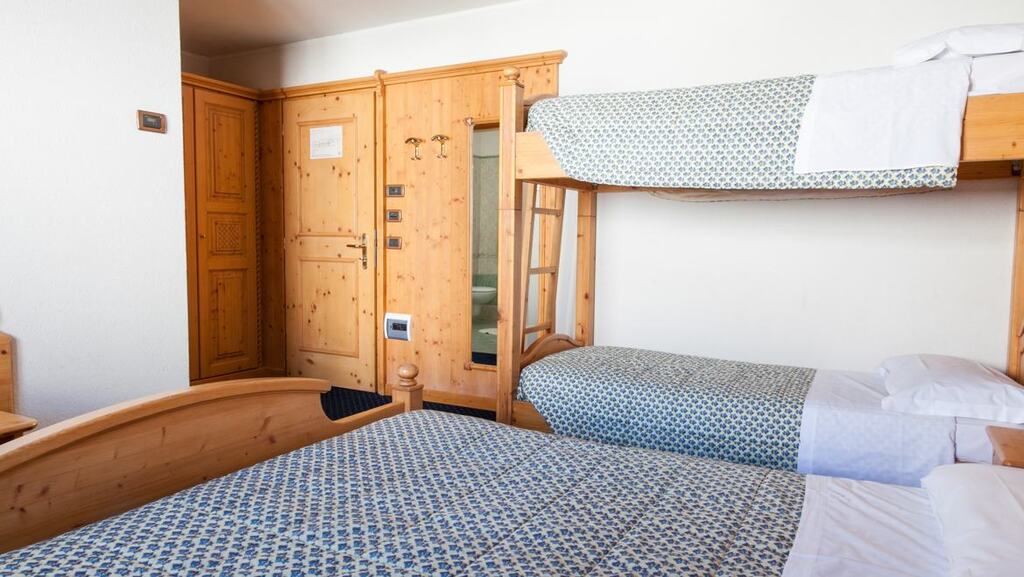 - 4-posteľová izba Superior (3-4 osoby, cca 18-22 m2): izba s 3, 4 alebo 5 posteľami (nie je možné doplniť ďalšiu posteľ ani detskú postieľku). Výhľad na svahy alebo balkón alebo najvyššie poschodie s výhľadom na masív Presanella.