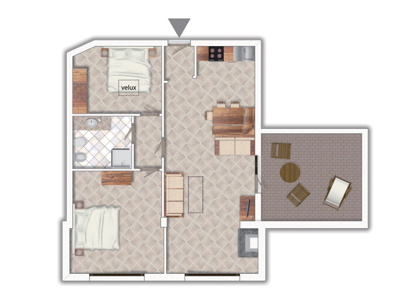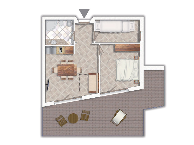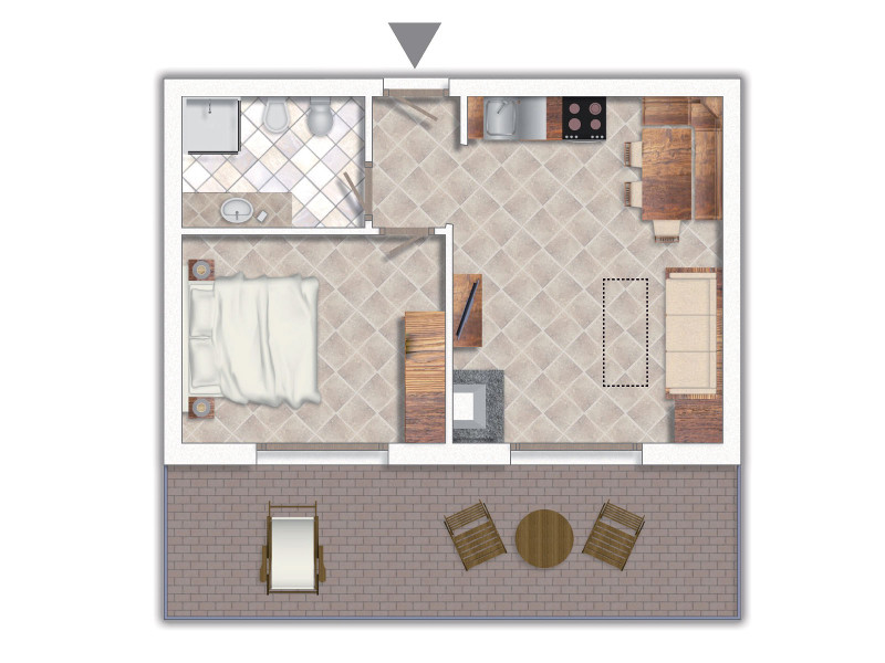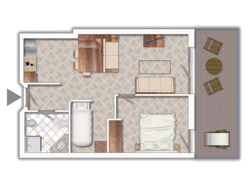 - Trilo classic: Apartmán pre max. 5 osôb, 45 m2. Spálňa pre 2 osoby (2 os.), výklenok bez okna s poschodovou posteľou (2 os.), obývacia izba s 1 pohovkou a 1 vyťahovacou posteľou (2 os.), vybavený kuchynský kút, kúpeľňa so sprchovacím kútom a sušičom vlasov. Balkón.