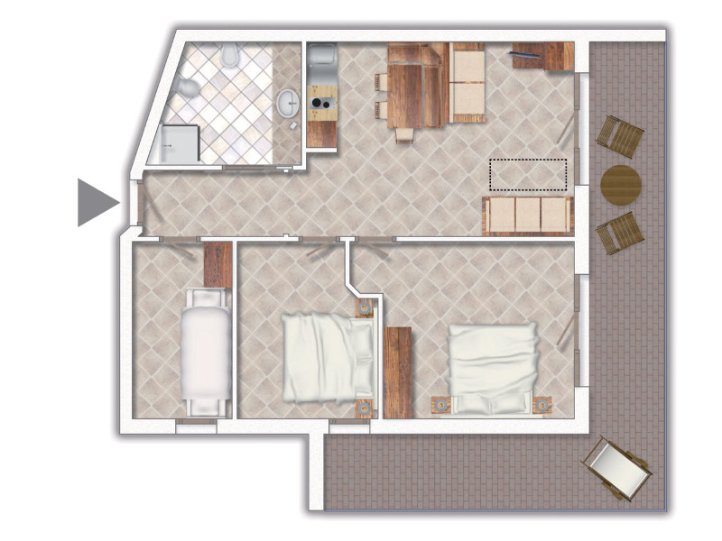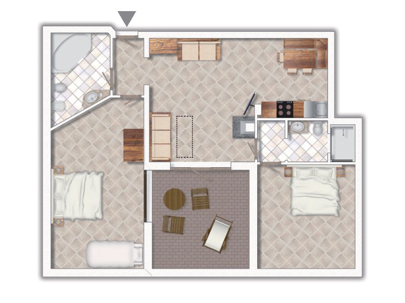 - Trilo superior plus B: Apartmán pre max. 6 osôb, 75 m2. 2 spálne pre 2 osoby (2x2 os.), 2 kúpeľne, obývacia izba s 1 pohovkou a 1 vyťahovacou posteľou (2 os.), vybavený kuchynský kút s umývačkou riadu. Balkón.