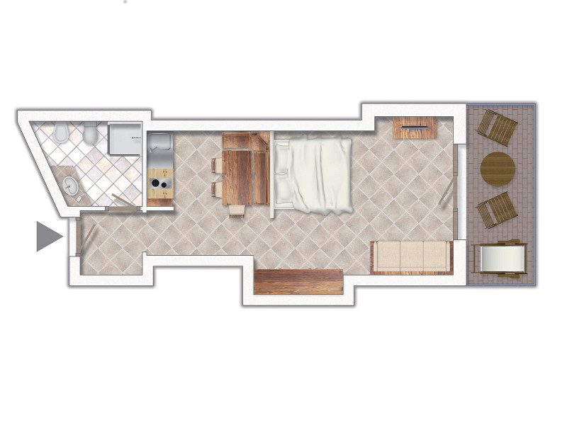 - Štúdio 2 obsadené 2 osobami (označenie partnera Mono): Štúdio pre 2-3 osoby, 28 m2. Má obývaciu izbu s 1 manželskou posteľou a 1 pohovkou pre 1 osobu (3 os.), vybavený kuchynský kút, kúpeľňa so sprchovacím kútom a sušičom vlasov. Balkón.